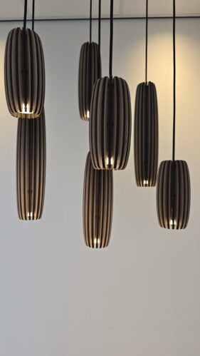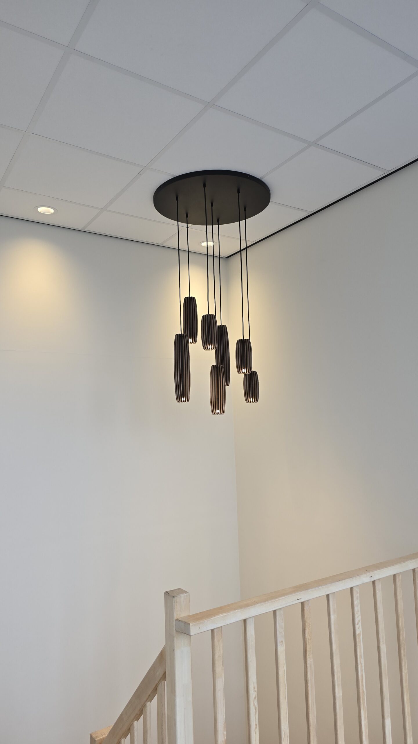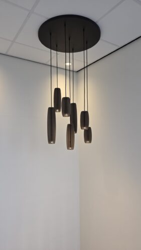 In samenwerking met Studio Cherelle hebben wij hiervoor handgemaakte hanglampen geleverd. De duurzame hanglampen zijn gemaakt van hout (MDF) en geven in combinatie met een mooie filament LEDlamp een warme en lichte uitstraling.