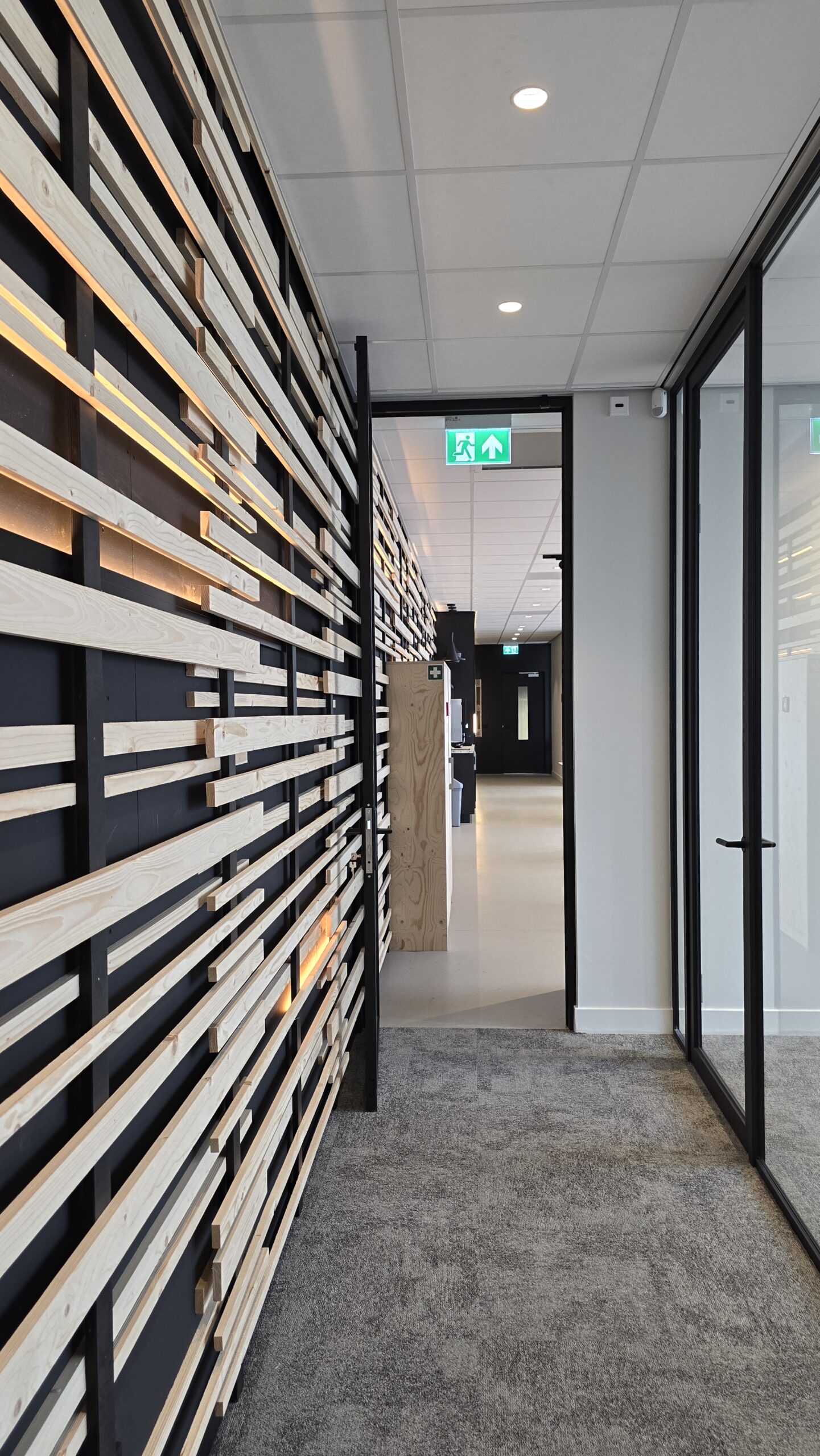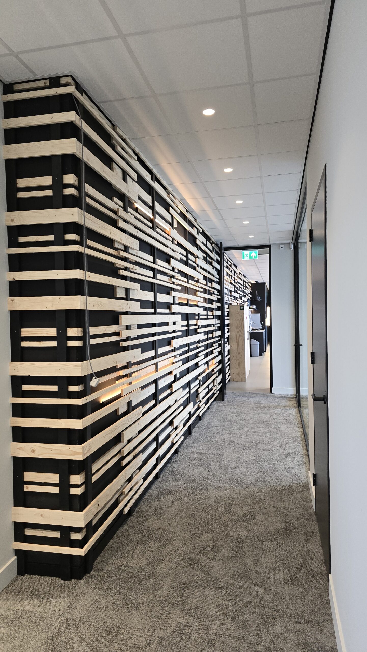 Door deze werkzaamheden leek het hen mooi om op verschillende plekken pallets of palletonderdelen aan de wand te monteren. Deze hebben wij uitgelicht door verschillende lengtes LED-strip erachter te monteren. Zo krijgen deze pallets diepte en karakter.