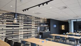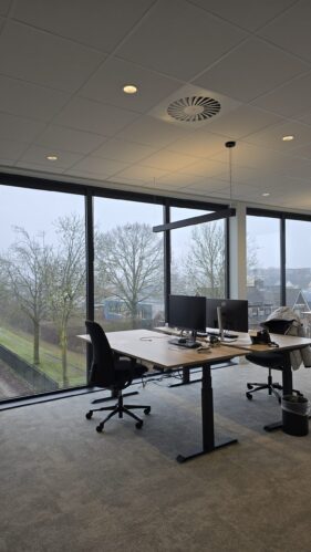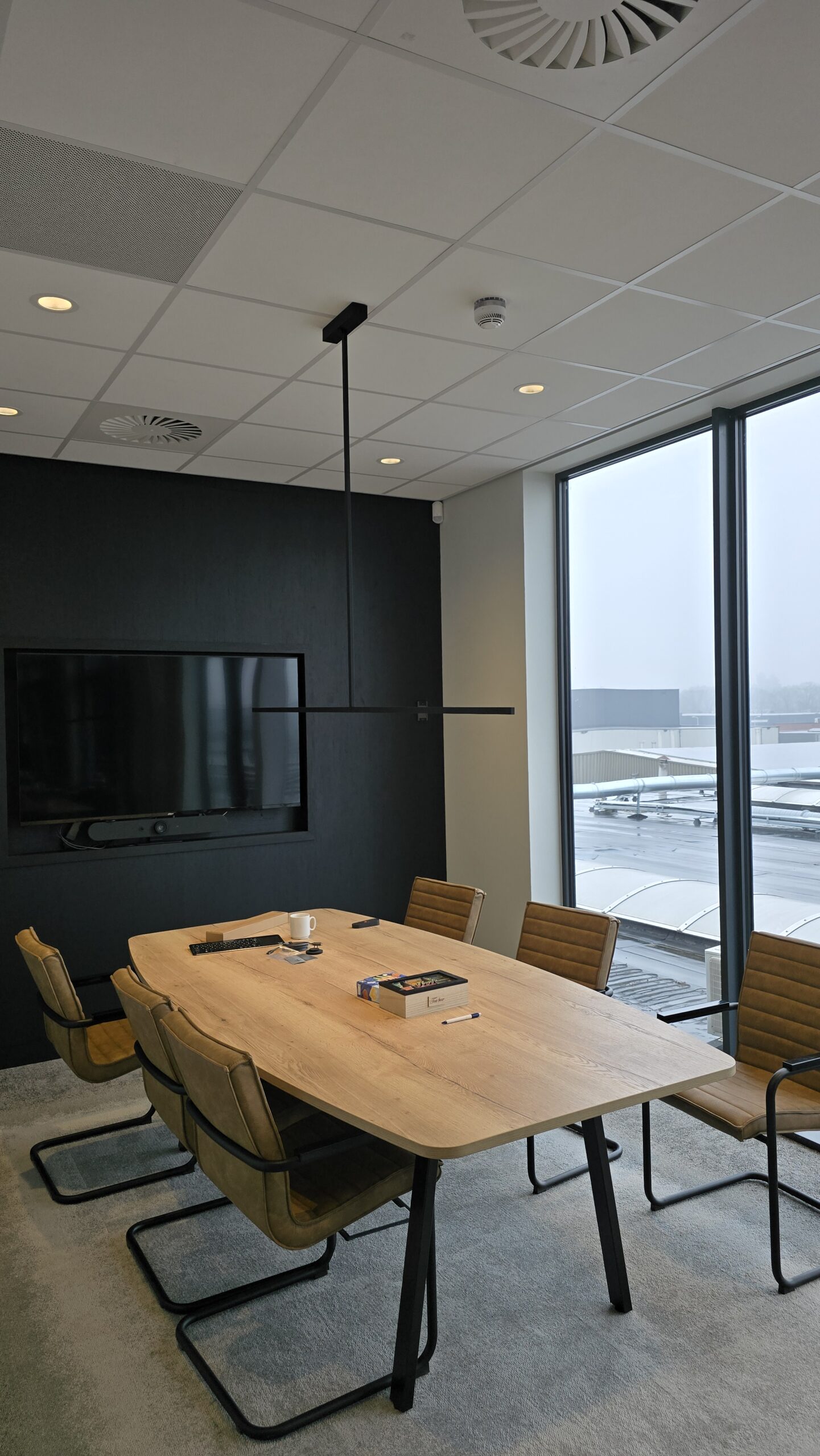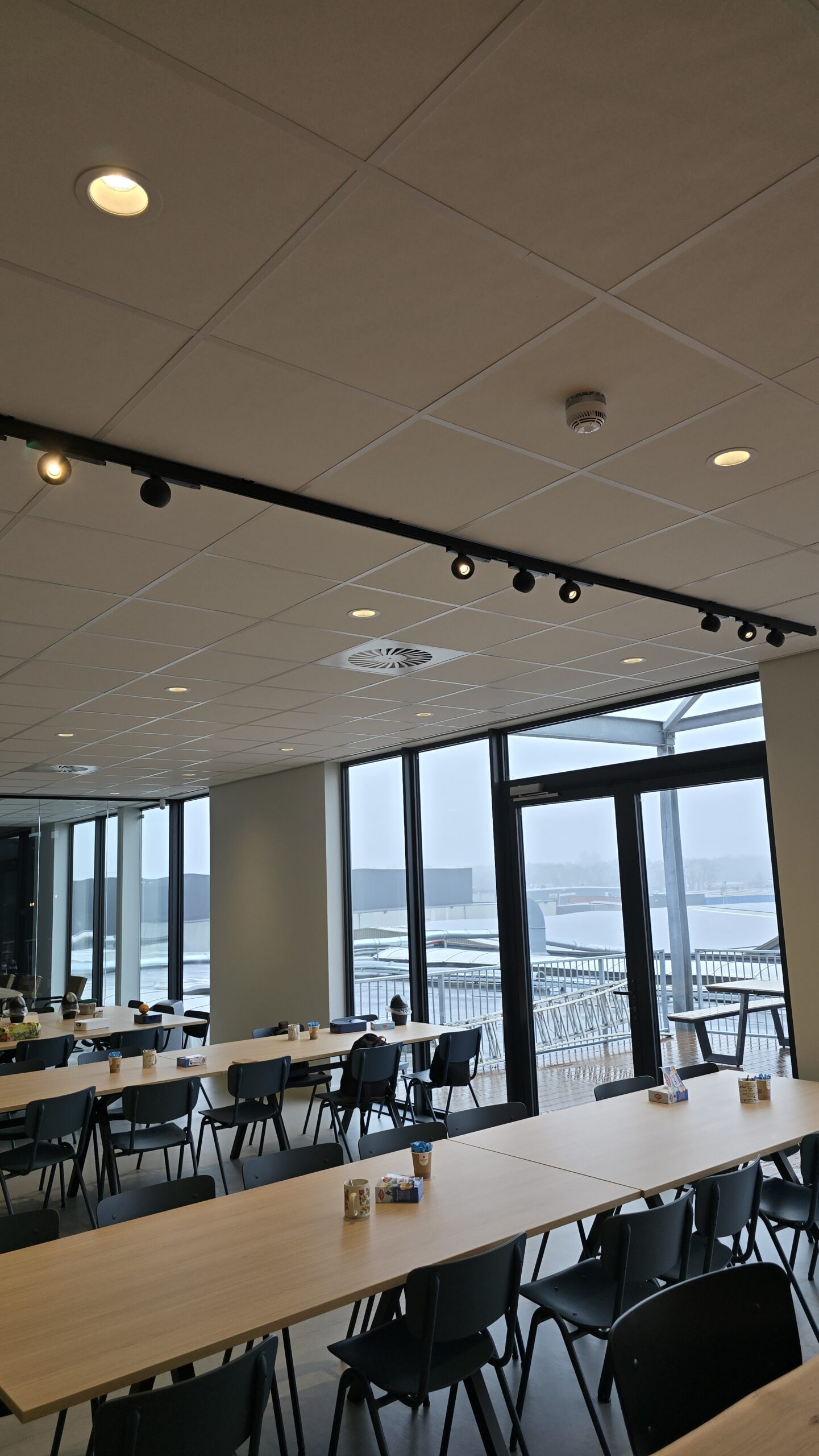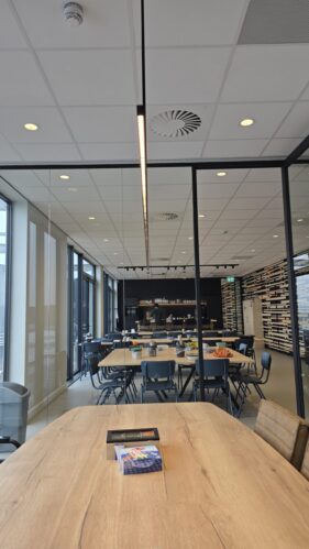 Als basisverlichting hebben wij onze downlighter Milaan toegepast en boven de bureaus een pendelarmatuur van Ideal Lux (Steel) voor de juiste belichting op werkniveau. In de kantoorgebieden maken we gebruik van aanwezigheid sensoren van Theben, zodat er geen verlichting overbodig blijft branden.