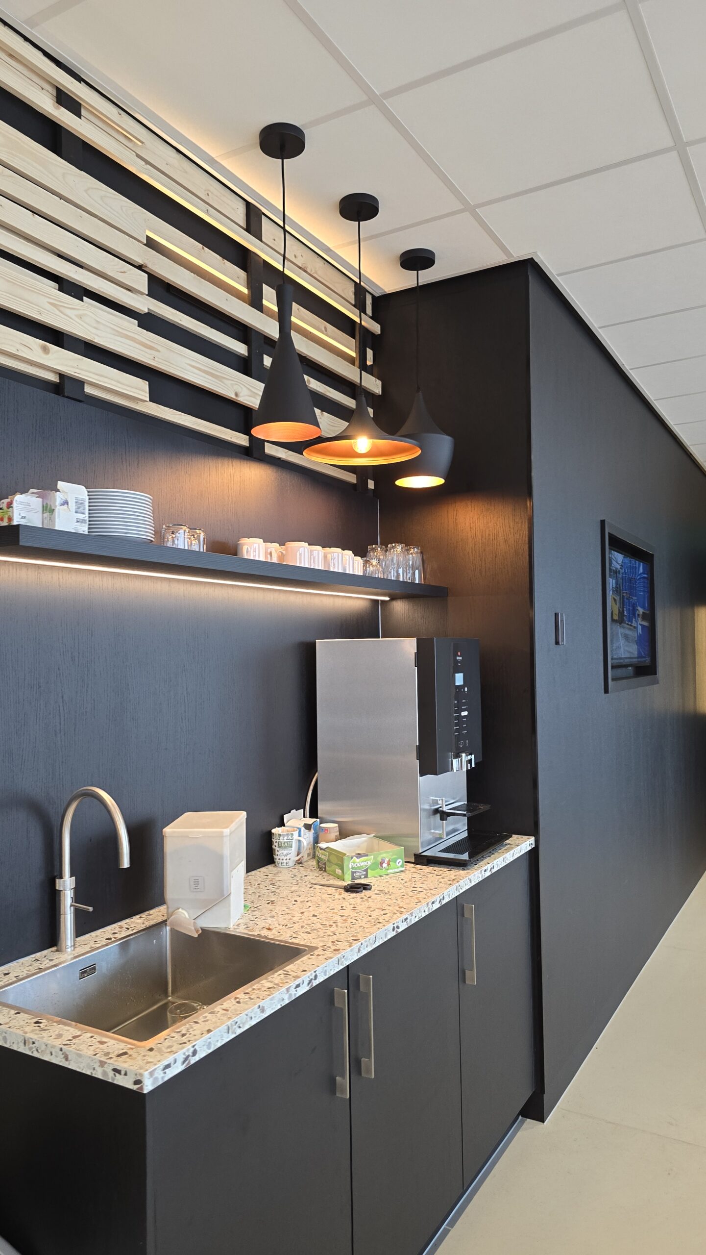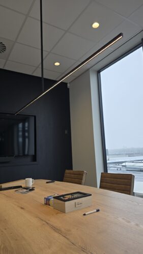In de gangzones mocht het wat donkerder en daarin hebben wij gebruik gemaakt van de Praag. Boven de vergadertafel de Fil 2.0 van Wever en Ducré voor een minimalistisch gevoel. Verder hebben we verschillende hanglampen toegepast om sfeer te creëren in de verschillende ruimtes. Boven de koffiecorner bijvoorbeeld hangen enkele lampen van One Light in een set van 3. Naar wens van de klant hebben we in de trackrail kleine bollen toegepast.