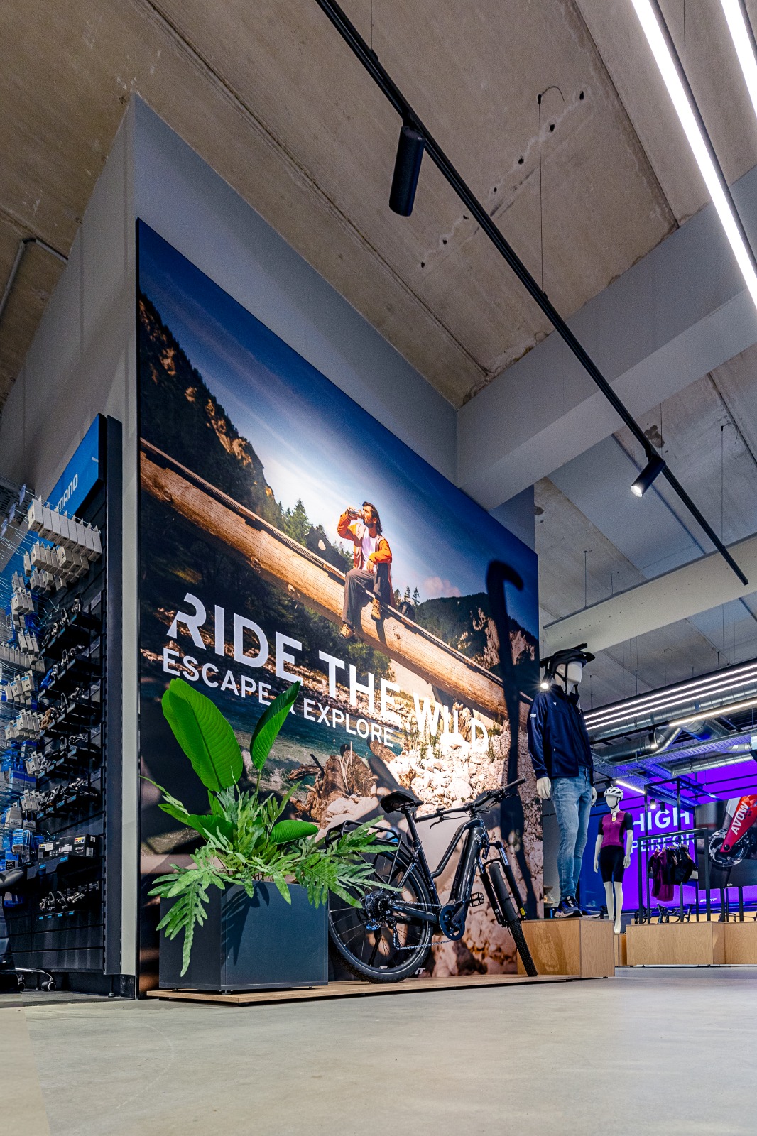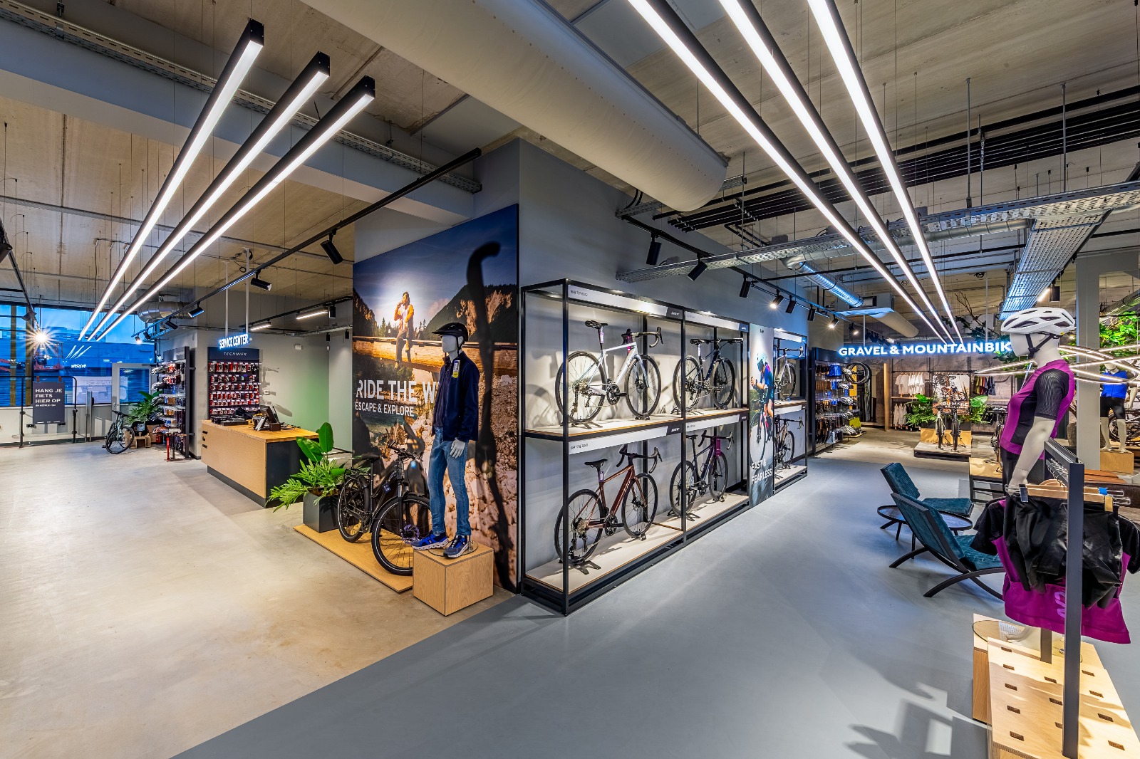 Een belangrijk onderdeel van deze beleving is de verlichting, geleverd door Spectrus. Voor de productpresentatie is gekozen voor 3-fase rails met de Emilux Linear als basisverlichting en als spot de Emilux Modena, waarmee fietsen en accessoires gericht en flexibel worden uitgelicht. Dankzij de hoge Ra-waarde van de armaturen komen de kleuren van de fietsen en accessoires optimaal tot hun recht en wordt de kwaliteit van de producten extra benadrukt.